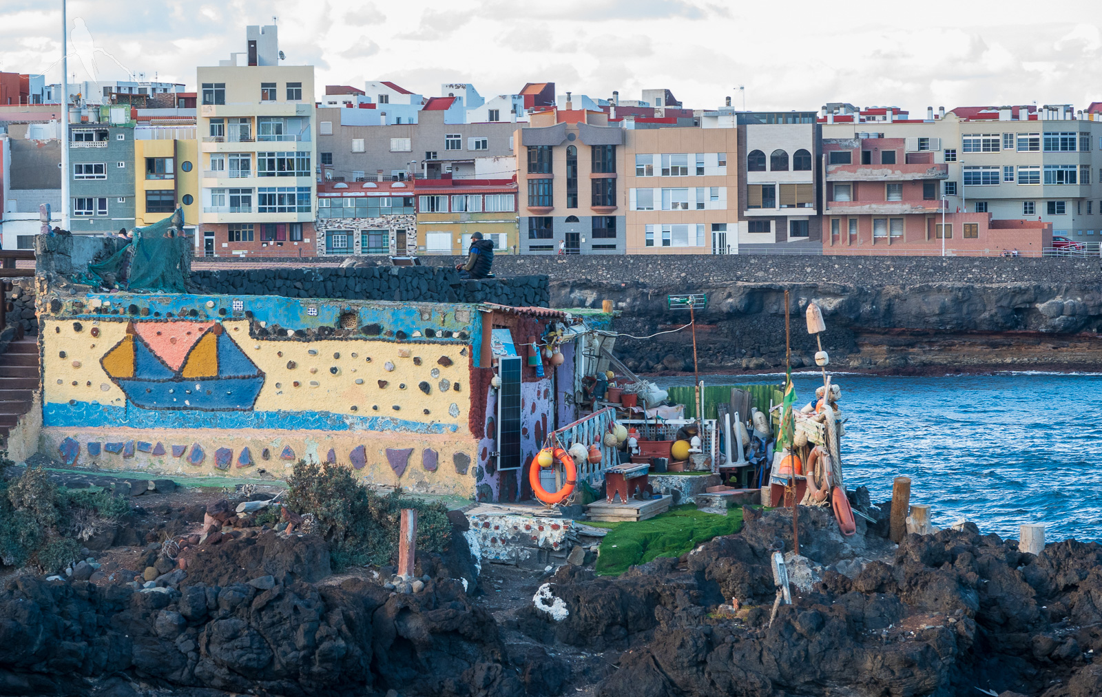 Längre bort vid ett märkligt hus sitter en man med transistorradio och ett tetrapack vin inslaget i plastpåse. Jag sätter mig bredvid och vi börjar prata: Om huset som hans mamma har byggt, om hans tid som kock i Playa del Inglés och om små vardagsrutiner.