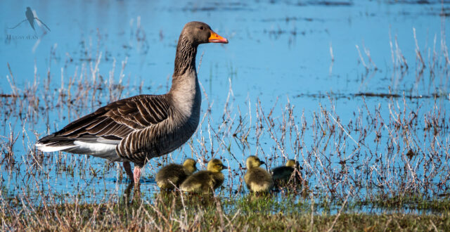 Grågås med ungar. Naturum Tåkern, Östergötland. 22 april 2022